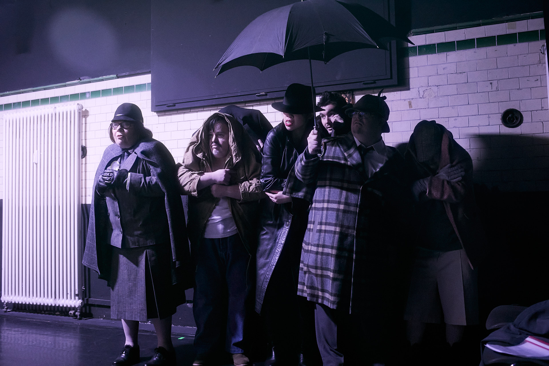 Wenn diese Finalbeschreibung annehmen lassen sollte, dass vorher ein harmonischer Theaterabend stattgefunden hat, der folgekonsequent mit einer harmonischen Verabschiedung endete, dann ist das ein Irrtum. Der Theaterabend war eine Herausforderung auf mehreren Ebenen, denn er erfüllte kaum eine der gängigen Konventionen, die ihrerseits die Erwartungen präfigurieren. Die Inszenierung „Mord im Regionalexpress“, die Milan Peschel zusammen mit dem RambaZamba-Ensemble – ein Ensemble, in dem Schauspielende mit und ohne Behinderungen zusammenarbeiten – auf die Bühne des inklusiven Berliner RahmbaZamba Theaters (RZt) gebracht hat, suggeriert mit ihrem Titel, dass im Regionalexpress ein Mord stattgefunden habe. Allerdings fehlt von einer Leiche („War es etwa ein Schauspieler in der Sinnkrise?“) jede Spur. Zwar sind die Umrisse eines menschlichen Körpers auf dem Bühnenboden nachgezeichnet, sie lassen sich aber nicht füllen. Aufgrund dessen bilden die Reisenden des Regionalexpress eine Sonderkommission, deren Kostüme Referenzen sowohl zum Krimiklassiker „Mord im Orientexpress“ von Agatha Christi, als auch zur Kriminalliteratur „Sherlock Holmes“ von Arthur Conan Doyle herstellen. Verfolgungsjagden, Schießereien und Rempeleien, vertont durch entsprechende Filmmusik, lassen vermuten, dass hier ein Kriminalstück mit Komödienanteilen gespielt werden könnte. Denn auch ein Blues Brother ist Mitglied der Sonderkommission. Aber bis zum Schluss ist unklar, was, warum, wozu und gegen wen hier ermittelt wird. Hieu Pham, Zora Schemm, Franziska Kleinert, Moritz Höhne, Christian Behrend, Joachim Neumann, Anil Merickan und Milan Peschel (als Ersatz für Jan Bülow) drehen und winden sich um ein Zentrum, das nicht existiert, obwohl es wieder und wieder motivisch durch Sprache zu bilden versucht wird. Kurzerhand benennen sie sich in „Sonderkommission für unlösbare Widersprüche“ um und führen ein weiteres Thema ein: