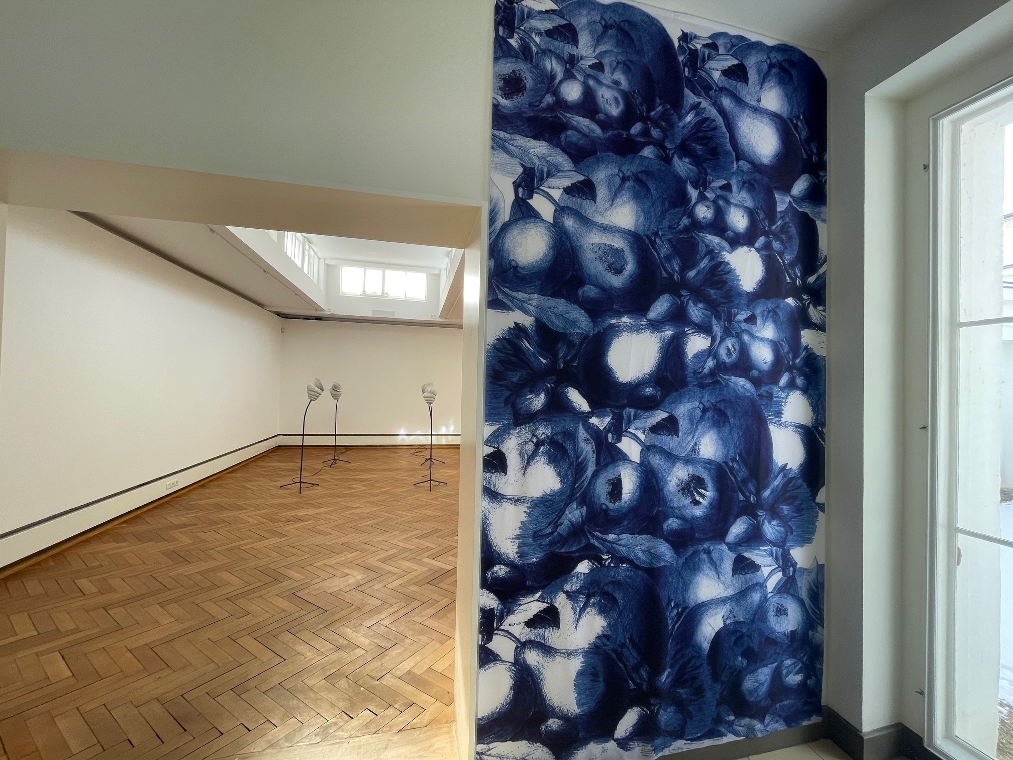 Das Bildmotiv der Haselnüsse, zwei kleiner Birnen und einer Quitte entstammt einer Zeichnung Julias in dem Poesiealbum einer Mitschülerin, die als eine der wenigen Quellen im Lübecker Buddenbrockhaus erhalten ist und ausgestellt wird. Dieses Motiv ist Ausgangspunkt einer Vielzahl künstlerischer Verarbeitungen durch Melián: In einem Blau-Ton ist es als Rapport auf einem raumhohen Fahnentuch gedruckt, multipliziert sich dadurch, wird häufiger und blauer und unübersichtlicher und ornamentaler … In einem Grisaille-Ton ist es übergroßes Einzelmotiv eines Gobelins der Größe 1,65 x 3,90 Meter, kombiniert mit historischen Darstellungen des brasilianischen Urwalds aus dem 19. Jahrhundert. Bevor sie als Collage Motiv des Gobelins – einer bevorzugten Kunstgattung des 19. Jahrhunderts – wurden, durchliefen sie einen mehrfachen Medientransfer: von Julias Zeichnung in dem Poesiealbum und reproduzierten Motiven in naturkundlichen Bildatlanten von Julias Zeitgenossen, über Meliáns Handyfotos von Archivmaterial, bis hin zur Übersetzung der digitalen Reproduktionen durch einen Webstuhl, der das Motiv haptisch in Wolle und Baumwolle übersetzt. Und selbst Unschärfen dieser medialen Übersetzungsprozesse haben es in den Gobelin geschafft: Im linken Teil des Gobelins sind ähnlich wie der sphärische Sound der Kindermelodie Reminiszenzen an das Merging der künstlerischen Techniken zu sehen, die ahnen lassen: Erinnern und Imaginieren fallen zusammen. Oder mit Siri Hustvedt formuliert: Unsere innere Erfahrung von Bildern, Gedanken, Erinnerungen, Phantasien verfüge über keine Ähnlichkeit mit den objektiven Realitäten von Hirnregionen, synaptischen Verbindungen, neurochemischen Stoffen und Hormonen (vgl. Siri Hustvedt: Drei emotionale Geschichten, in: Leben, Denken, Schauen, Reinbek bei Hamburg 2014).
