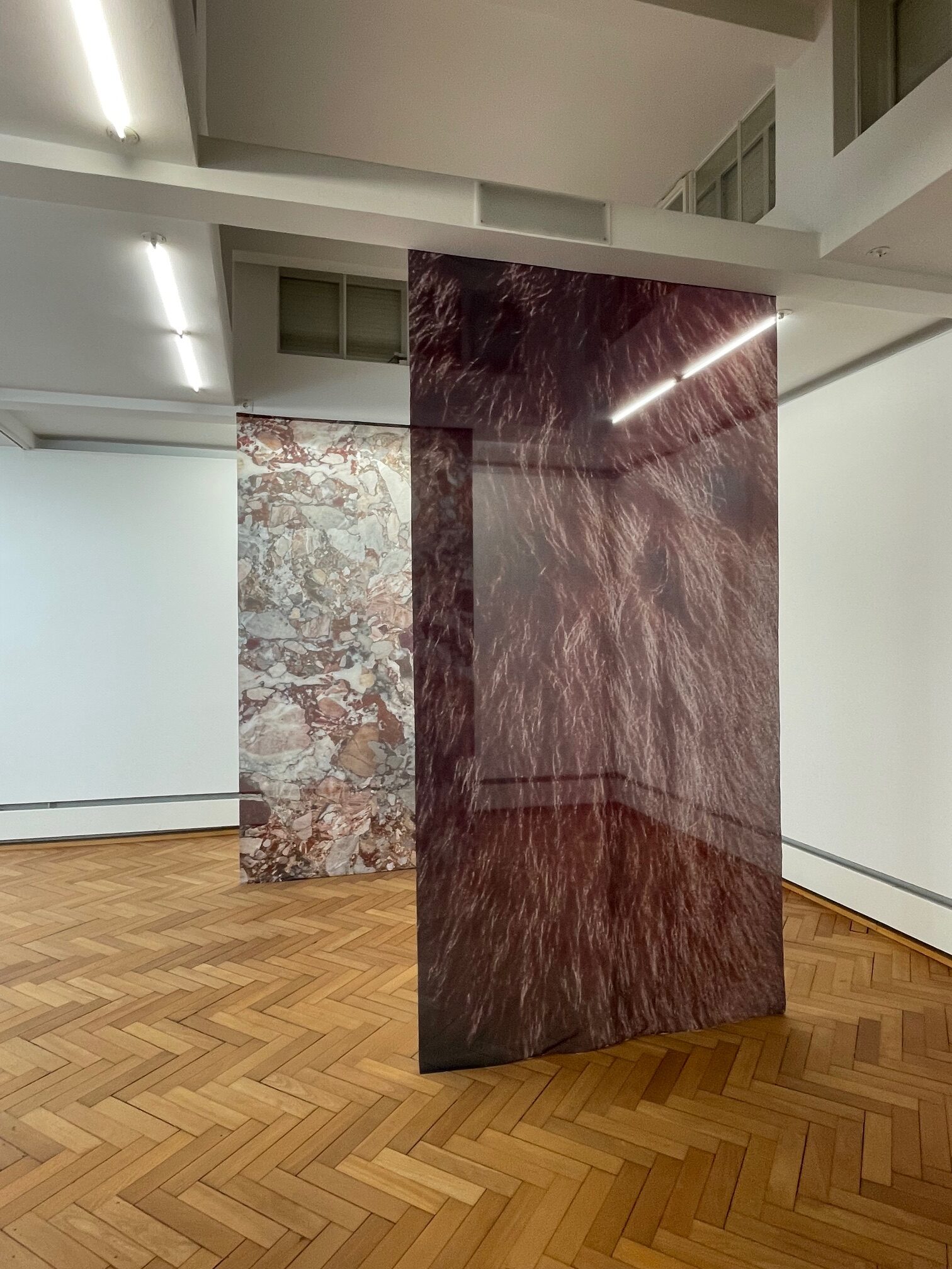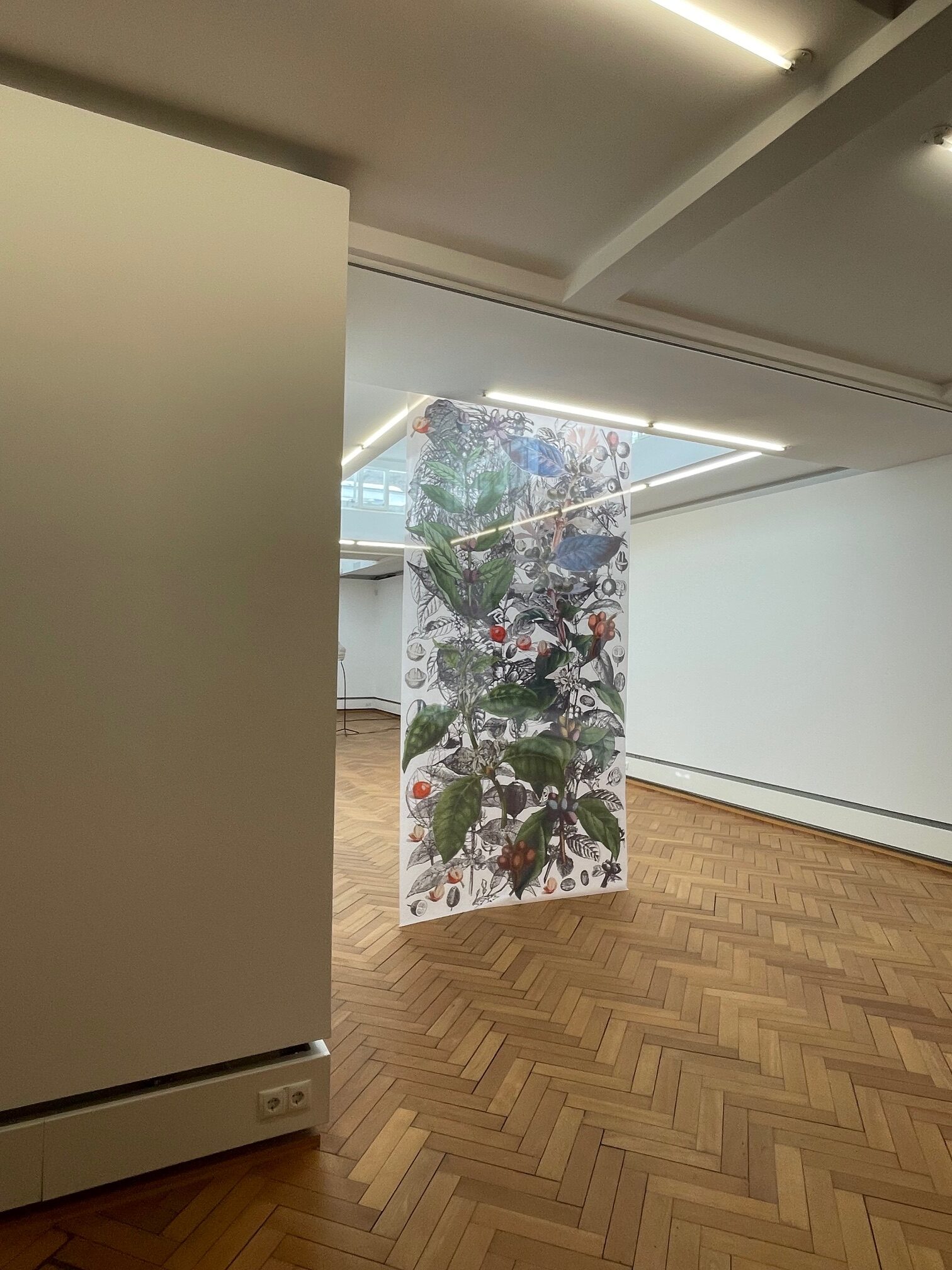 Sechs weitere bedruckte raumhohe Fahnentücher können sich daher noch weiter im Echoraum von Erinnern, Wiederholen und Durcharbeiten (Sigmund Freud, 1914) vom Ausgangsmotiv entfernen: Sie zeigen collagierte Abbildungen von brasilianischem Kaffee und Zuckerrohr, den Anbauprodukten Julias Vater, naturkundlichen Stahlstichen aus Bildatlanten des 19. Jahrhunderts entnommen. Sie zeigen den vergrößerten Ausschnitt eines Handyfotos Meliáns, das das Fell des ausgestopften Bärens referenziert, den Julia da Silva-Bruhns und Thomas Johann Heinrich Mann zur Hochzeit geschenkt bekamen und im Eingangsbereich der Lübecker und später Münchener Familienvilla stand. Und sie zeigen ebenfalls vergrößert den Ausschnitt eines Handyfotos des Taufbeckens in St. Petri. So werden Stationen von Julia Manns Leben zu Bild- und Medienmotiven und als raumhohe und durchscheinende Fahnenstoffe zu Raumteilern: ihre Kindheit im 19. Jahrhundert, inmitten von Kolonialisierung, industrieller Revolution und bürgerlichem Lübeck, von Darstellungsformen, Materialien, Prestige und Religionen. Denn kaum, dass sie den brasilianischen Katholizismus ihrer ersten Lebensjahre verlassen musste, wurde sie evangelisch umgetauft und umerzogen.