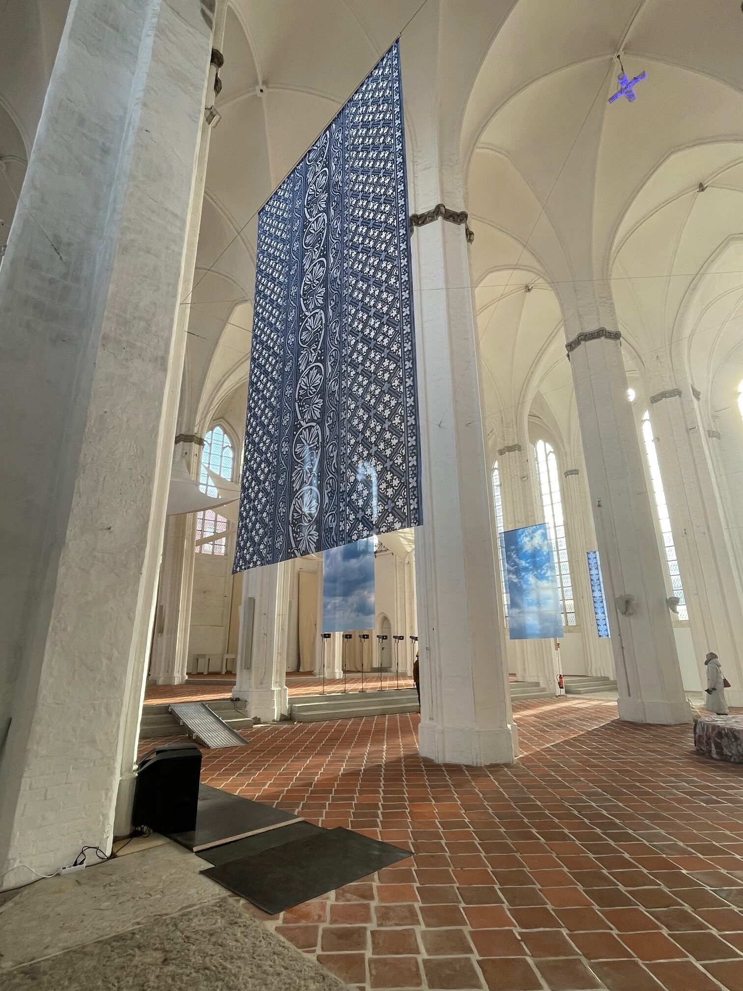 Hinzu kommen in die Kirchenschiffe gehängte Fahnentücher: In den äusseren Schiffen schweben sechs Fahnen mit den Rapporten sowohl von erhaltenen Deckenfresken in St. Petri als auch von 1945 zerstörten Kirchenfenstern, die Melián im Lübecker Stadtarchiv recherchiert hat. In den inneren Schiffen schweben Fahnen mit Ansichten von vier blauen Himmeln, dem Himmel über Rio de Janeiro, Lübeck, Bayern und dem Mittelmeer. Sie liefern den zerstreuten und dezentrierten Blick und den zerstreuten und dezentrierten Standort.