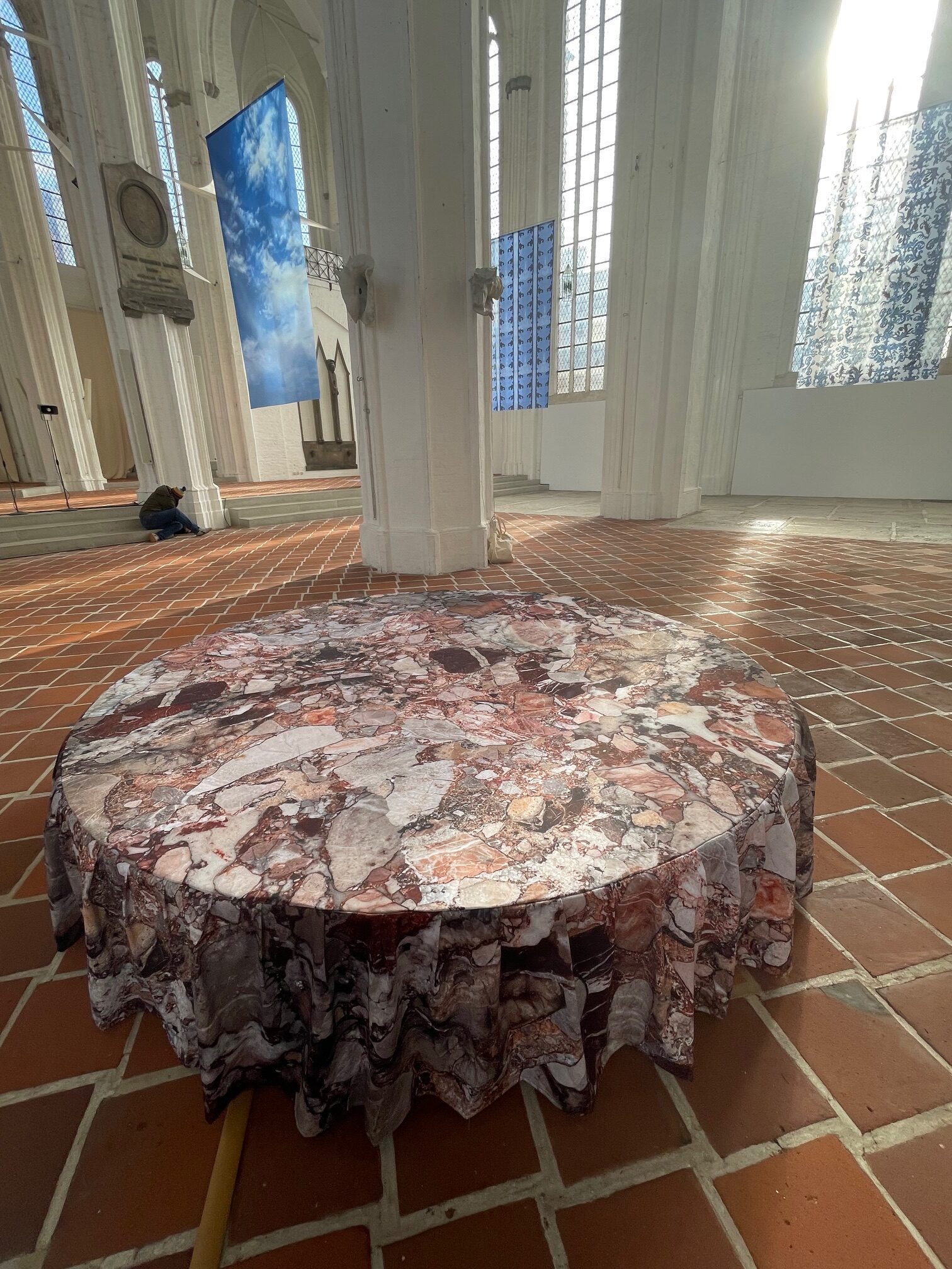 In der fünfschiffigen gotischen, weiß getünchten Hallenkirche St. Petri, die bis auf wenige Prinzipalstücke wie die Orgel, der Altar, das Kreuz und das Taufbecken leer geräumt ist, ist nun in der scheinbaren Mitte – denn es gibt in St. Petri keine Mitte und damit auch keine Symmetrieachse – eine sich drehende, runde Sitz- und Liegeskulptur im Durchmesser von etwa drei Metern installiert. „Andante Calmo“ ist stofflich mit einem Fahnenstoff bezogen, auf den die Materialität des etwa 20 Meter entfernt, an die Seite gerückten und weitestgehend unzerstörten Taufbeckens aus Terrazzo vergrößert gedruckt ist. Im langsamen Tempo (Andante Calmo) dreht es sich im Kreis und lädt ein, sich darauf zu platzieren und dem Sound der Kindermelodie „Molequinho do meu pai“ zu lauschen, die hier im Kirchenraum opulenter als in der Overbeck-Gesellschaft von Melián produziert wurde.