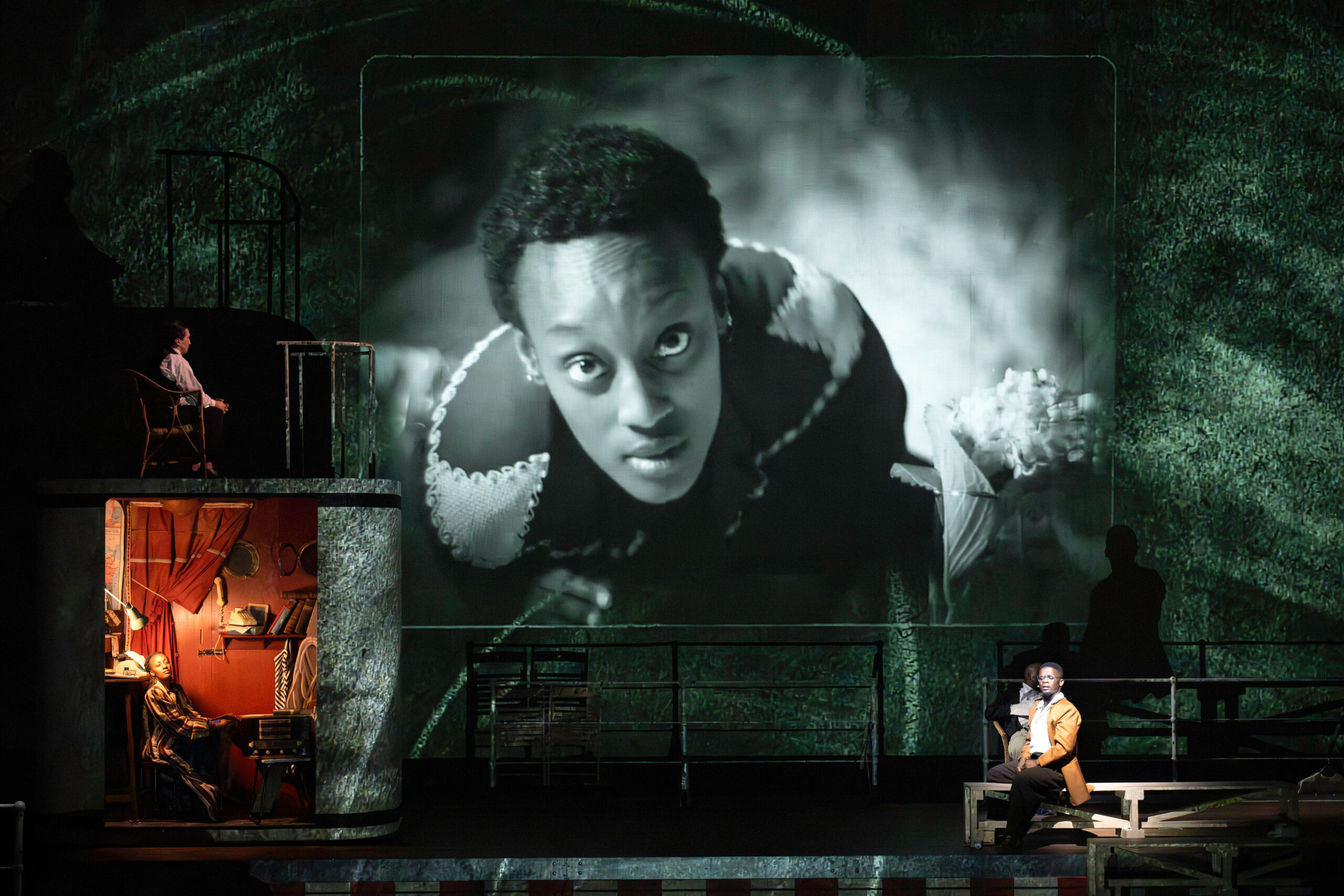 Kentridge lässt auf der Bühne ein Spektakel an dynamischen Cut-ups auf verschiedenen Ebenen stattfinden und fügt sein Opus aus vielen Vielheiten zusammen, ohne sie passend zu montieren: Die Textpassagen sind in den Sprachen der Darsteller*innen auf Englisch, Französisch, isiSwati, isiZulu, isiXhosa, Setswana, Xitsonga und Sepedi verfasst. Multimedial entsteht aus Kentridges unnachahmlichen Zeichnungen und ihren Animationen, aus Fotografien, Found footages und Filmen, aus Gesang, Tanz und Literatur, aus mimischer Darstellung, Musik und Gesang ein Universum, das sich aus Schichtungen und Überblendungen von Live-Handlungen auf der Bühne und Projektionen auf die Bühnenwand zusammensetzt. Während auf der Bühne der „Chor der Sieben Frauen“ das Geschehen mit Gesang, Rhythmus und Sprechgesang klanglich begleitet, wechseln die Darsteller*innen und Tänzer*innen ihre Rollen, indem sie ihre Gesichter mit übergroßen, schwarz-weißen Pappmasken der historischen Personen überdecken und damit entweder die Geflüchteten und Gefeierten von Surrealismus und Négritude verkörpern oder aber ihre Köpfe gegen perspektivisch zu große, surrealistisch anmutende Fisch- und Vogelköpfe, Espressokocher, Telefone und Schreibmaschinen austauschen. Diese collagierten Zusammenfügungen korrelieren mit den filmischen Projektionen auf der Bühnenwand, wenn Tortenstücke und Zylinder tanzen und in den Sternenhimmel rutschen, Land- und Schifffahrtskarten zerreissen und sich neu zusammensetzen, Man-Rays Lee-Miller-Auge auf Figuren aus dem Triadischen Ballett von Oskar Schlemmer auftauchen, zerstückelte Gliedmaßen sich auf einem Kuchenteller gegen ihre Zurichtung durch Messer und Gabel wehren, vitalisierte Schlingpflanzen sich über die Hinterbühne rekeln … Damit füllt sich die Bühne zu einem Kosmos von Absurditäten und Überdehnungen, übervoll mit Assoziationen und Sehnsüchten – ein Fest für Ikonograf*innen, die die verrätselten symbolischen Motive dechiffrieren können, die Kentridge seit über vier Jahrzehnten mit hohem Wiedererkennungswert in seine Werke einbaut.